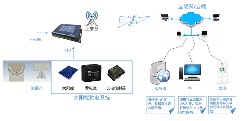 系統(tǒng)由雷達(dá)流速儀、超聲波液位儀、RTU、數(shù)據(jù)采集中集器、太陽能供電系統(tǒng)、流量模塊、管理軟件、移動數(shù)據(jù)卡、計算機(jī)等組成。